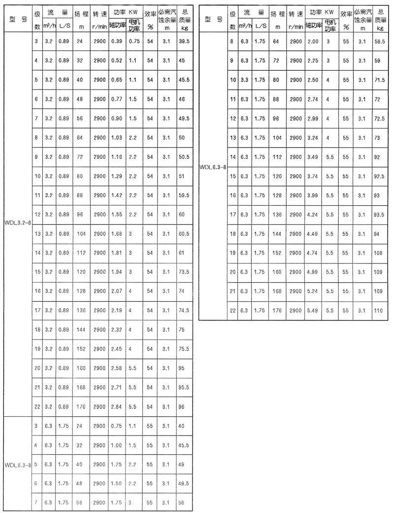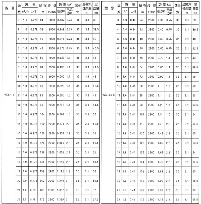 泵型號意義:如WDL1.6-8×10。1.6-流量(m/h);8-單級揚(yáng)程(m);10-級數(shù)。