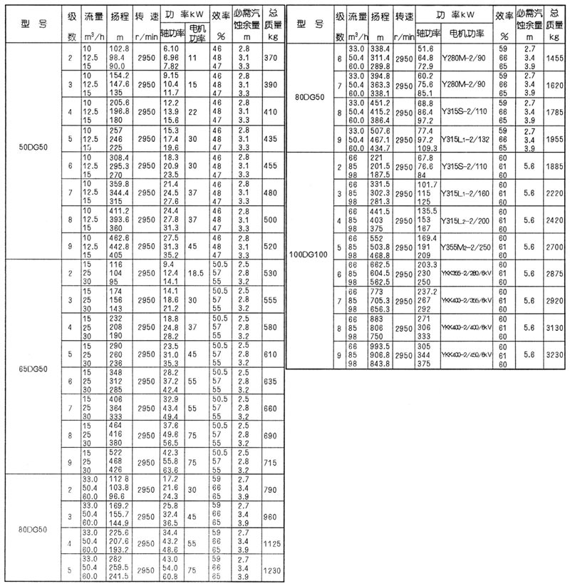 泵型號中的意義:如80DG50。80-泵進、出口直徑(mm);50-單級揚程(m)。